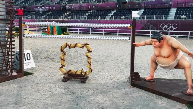 据美联社报道,东京奥运会马术障碍赛赛场上的一座相扑手雕像对运动员和马造成了一定的影响。有马术选手抱怨,这座在10号障碍物旁边的真人大小的雕像设置对马匹造成了惊吓,甚至有马被吓到不敢做动作。因为当马匹急转弯后准备通过这里时,首先会看到的就是“相扑手”的屁股,严重分散了骑手和马的注意力。